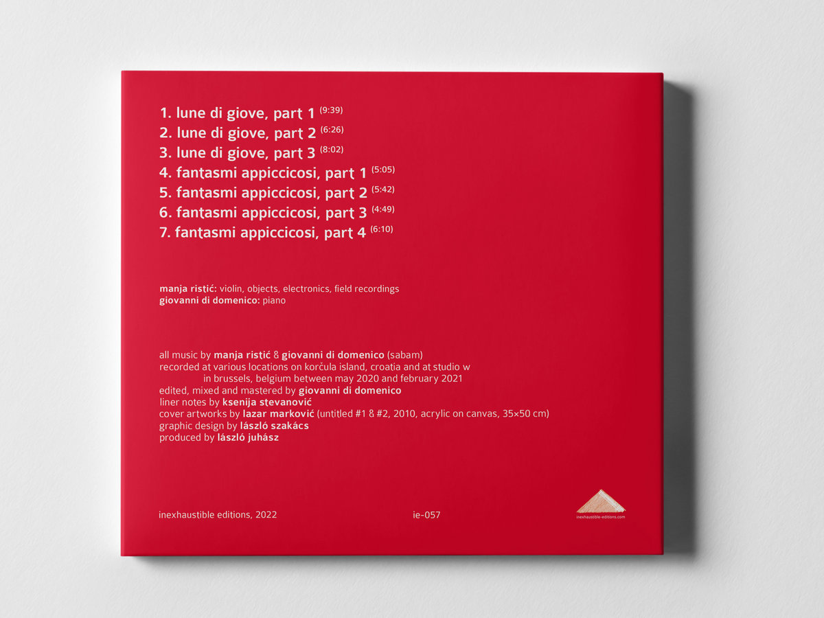 This is why the sound world of Alinea envelops the listener in a tight, friendly embrace from the very beginning. Manja and Giovanni merge their respective sound worlds fluidly, yet we can discern them individually. While Giovanni’s piano forms a sometimes rhythmical, sometimes lyrical pillar for every track, Manja’s violin swirls around, answers to its motivic calls, multiplies its lines, gives new trajectories, and propels it to move and to grow. And yet, in the background of it all, there are field recordings of water, sea, nature, human voices and movements, rain, birds, storm, insects, small accidental noises – the sound of everyday life and surroundings, whose effervescent mystery is delicately captured. As we know, Manja Ristić works with the materiality of sound in her oeuvre, manipulating it and putting it in a wider musical, conceptual, and political context. Usually, she communicates with these snippets of captured lived time with the help of violin, as her inner, abstract and lyrical voice. Therefore on Alinea, we actually have three layers of conversation: between soundscapes and violin, between their “ensemble” and piano, and between all of them at once. This is why the interplay between them feels fluid and seamless, allowing for a deep, exciting and ever-changing listening experience. And yet, if we are thinking of Alinea as a whole, we are experiencing something akin to a wave, that starts in the relative sparsity and grows to a strong energy pulsation, before returning to the slippery, watery calmness of its emerging sounds.